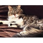 I found Angel on the sidewalk in my neighborhood when she was a little kitten. She was covered in fleas. We took her home and have loved her fiercely from that day. She was a feisty little girl; climbing trees and bringing us “gifts” from outside. She was deeply loved by the entire family. She was sweet and gentle; gorgeous and so loving, We will miss her terribly until we see her again